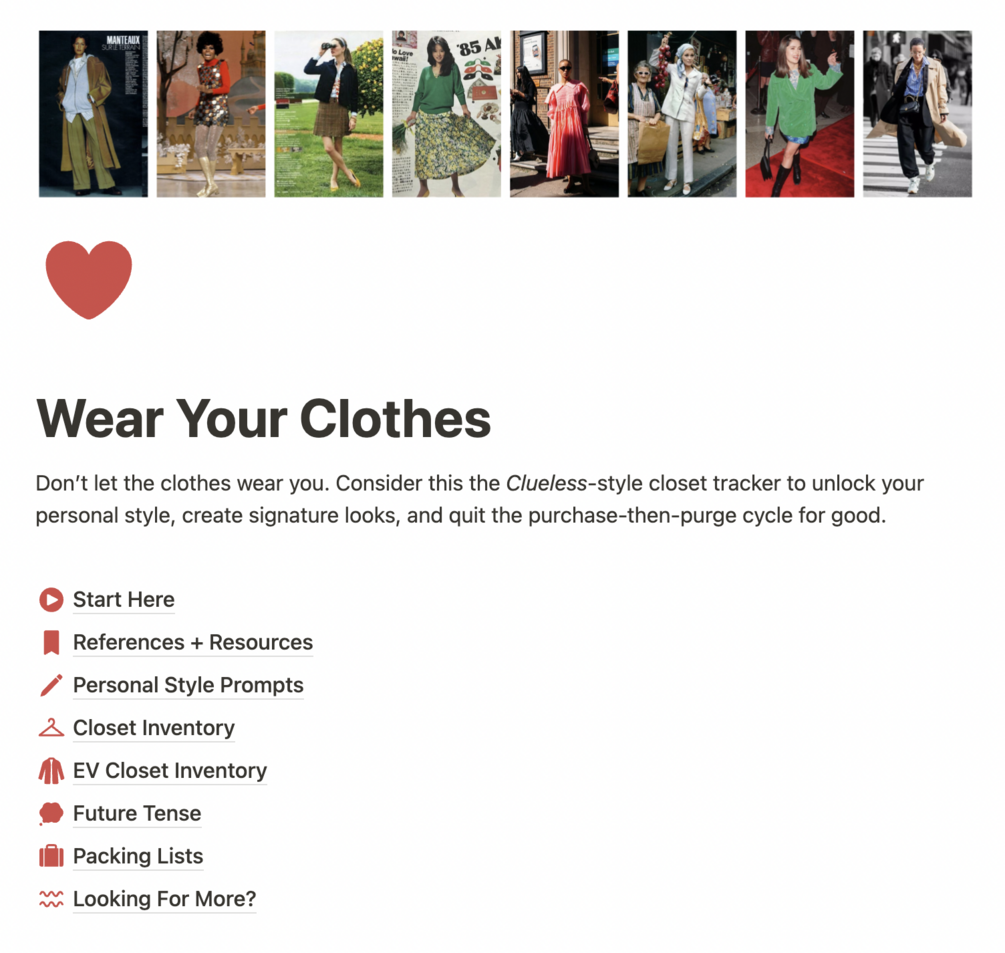 Welcome to Wear Your Clothes—the brainchild of fashion writer and Notion obsessee, Erika Veurink. This template is your guide to falling in love with your closet, defining your personal style, and feeling excited to get dressed every day.